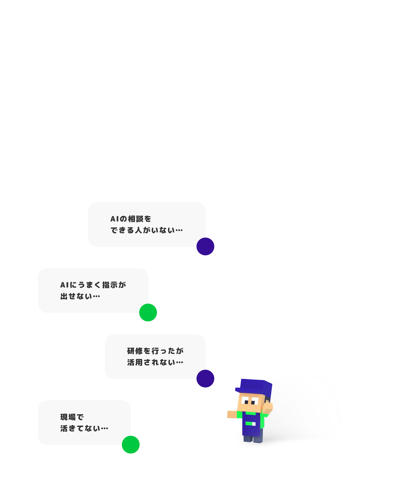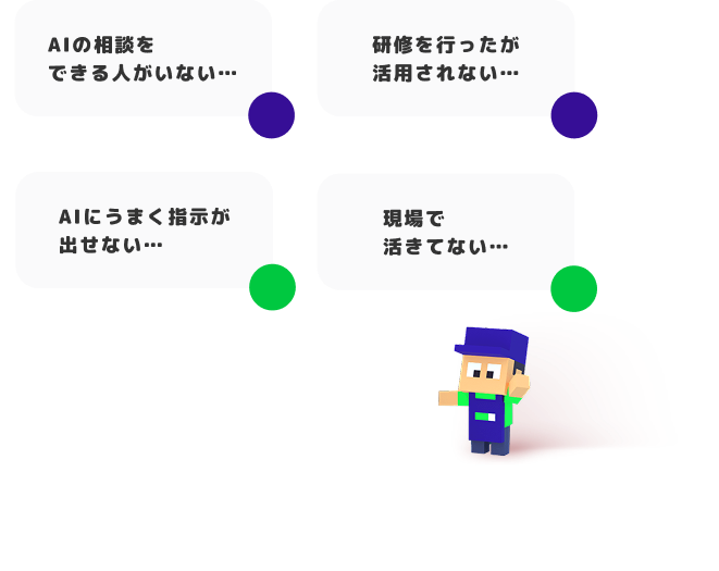 実務での活用方法がわからない、社内に相談相手がいない、プロンプト作成などのAIへの指示が上手くいかない、あるいはAIを導入したものの活用が広がらないといった課題に対し、『ちょこっとAI』が伴走支援を通じて解決へと導きます。
