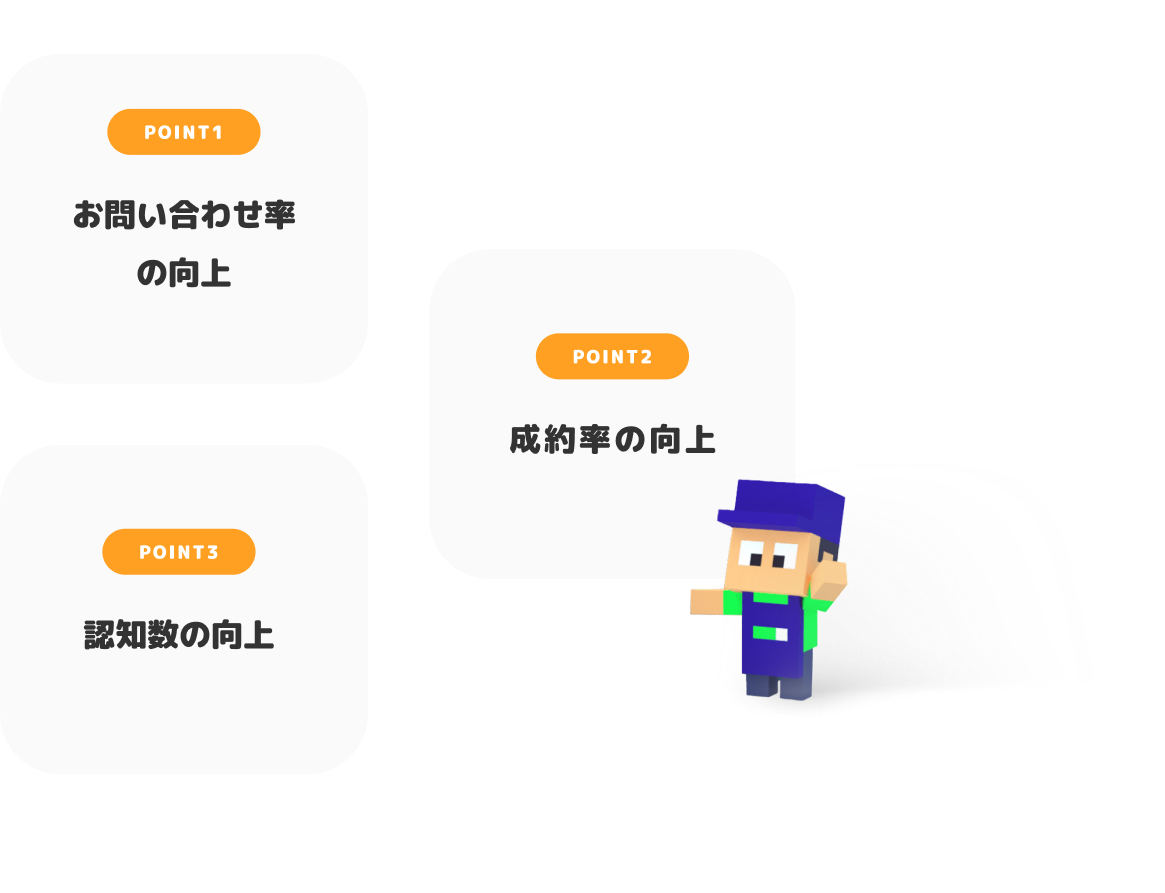 WEB施策の成果を認知数×お問い合わせ率×成約率という方程式で分解し、どこでつまづいているかを明確に特定。「認知されない」「問い合わせが来ない」といった課題をこの方程式に基づきピンポイントで改善することで、感覚に頼らないWEBサイトを制作、運用。確実な成果へと繋げます。